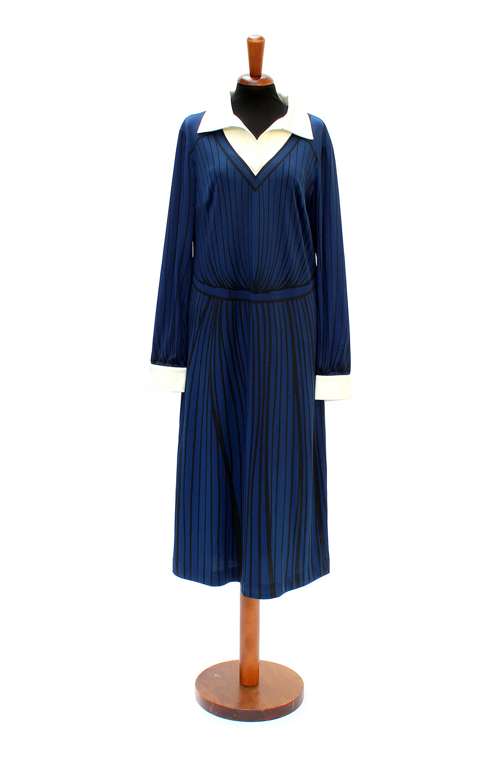 A "trompe l'oeil" calf-length jersey dress, black stripes on blue ground, white cola and cuffs, logoed buttons (tg. 46) (cm lsu)