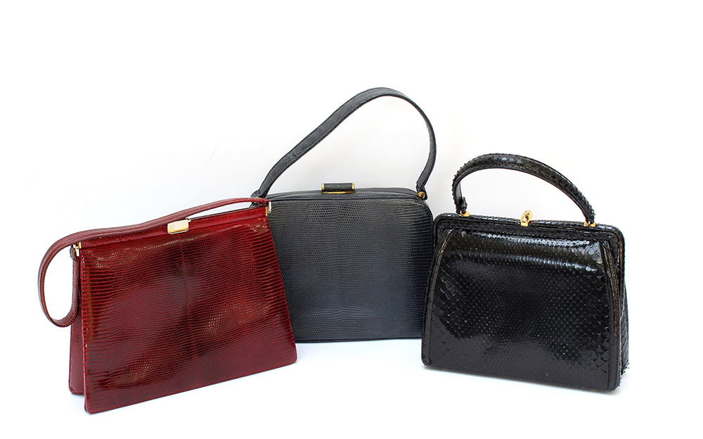 Lotto di tre borse a mano in rettile di diversi colori, dimensioni e modelli...
