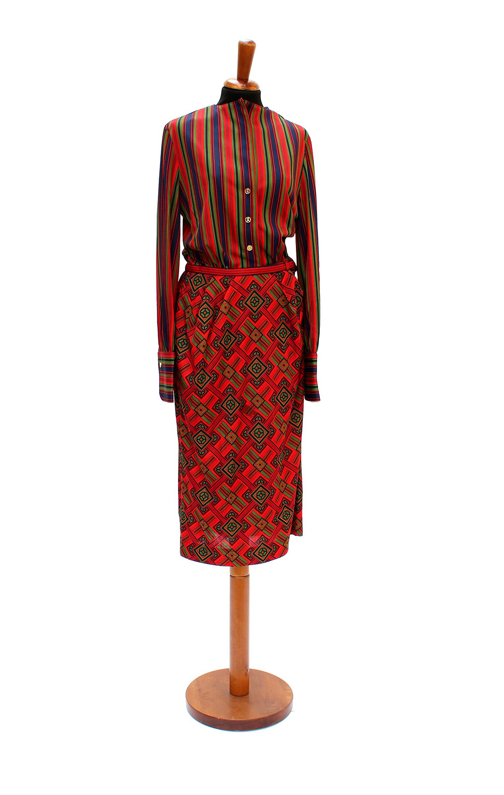 Vestito "trompe l'oeil" in jersey, camicia a righe e gonna fantasia nei toni del verde, rosso e blu, gemelli e bottoni logati (tg. 42) (lievi segni d'uso)