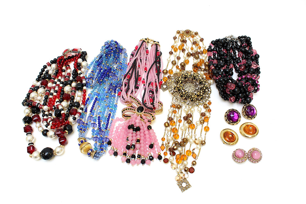 Lotto di cinque collane a più fili rifinite in diversi materiali come le tre paia di orecchini di cui uno firmato Valentino