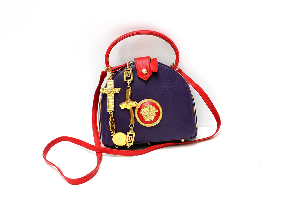 GIANNI VERSACE Borsetta a bauletto in pelle color verde, viola e rosso con...