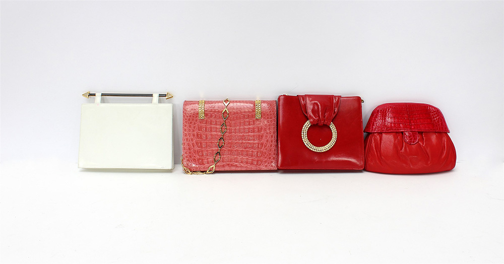 Lotto di quattro borsette in tinta unita, una rosa, due rosse e una bianca in materiali, modelli e misure diverse (lievi segni d'uso)