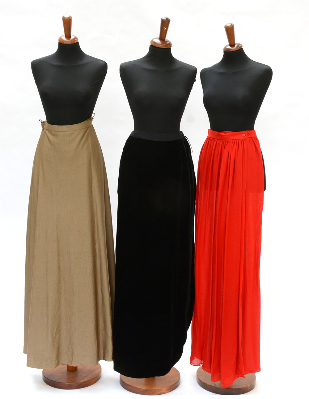Lotto di tre gonne lunghe in materiali differenti, un nera, una rossa e una tortora (taglie varie) (lievi segni d'uso)