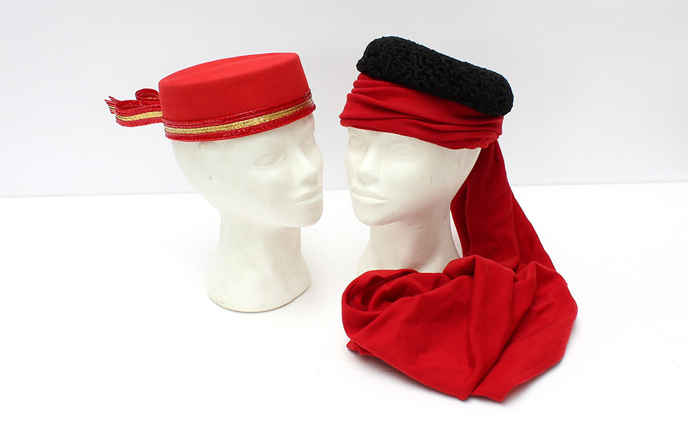 Lotto di due cappelli a fez, uno in lana rossa e astrakan nero, l'altro in lana rossa rifinito con passamaneria rossa e oro