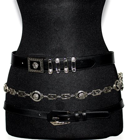 GIANNI VERSACE Lotto di tre cinture in differenti materiali, forme,...