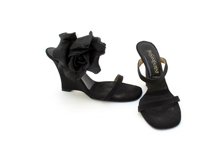 A pair of black silk wedge-heel sandals with a rose motif (tg. 36)