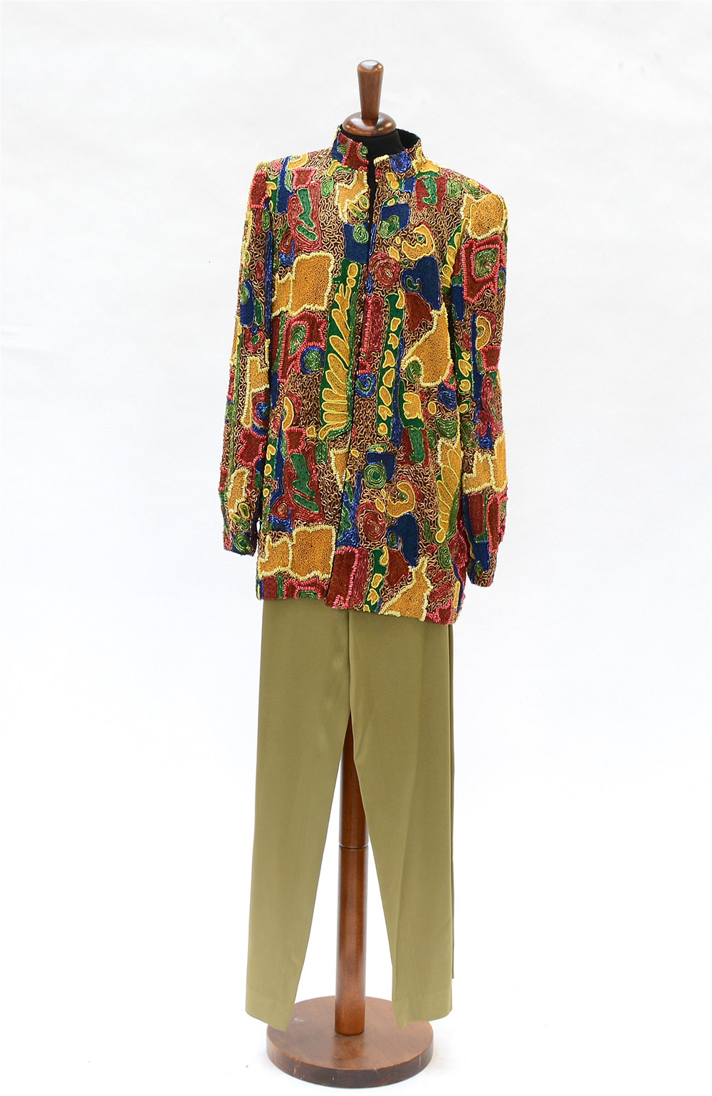 Completo composto da giacca con ricamo multicolor in paillettes, perline e canottiglie con pantalone palazzo in raso verde oliva con spacchi (tg. 42/44) (lievi segni d'uso)
