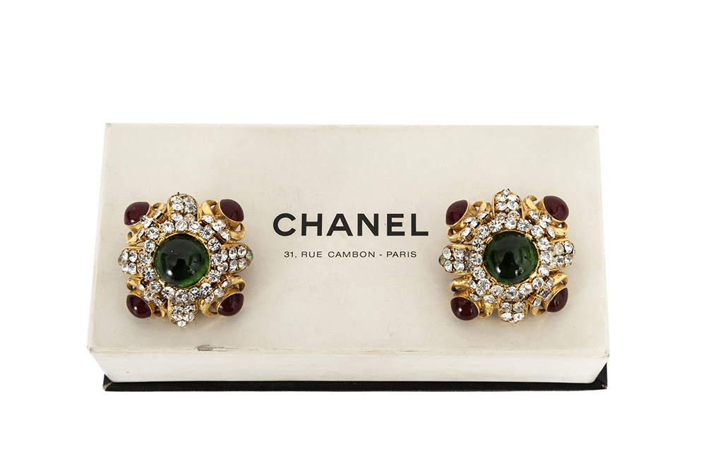 Paio di orecchini a clips in metallo dorato, strass e paste vitree cabochon color verde e rosso, in scatola originale (lievi difetti)