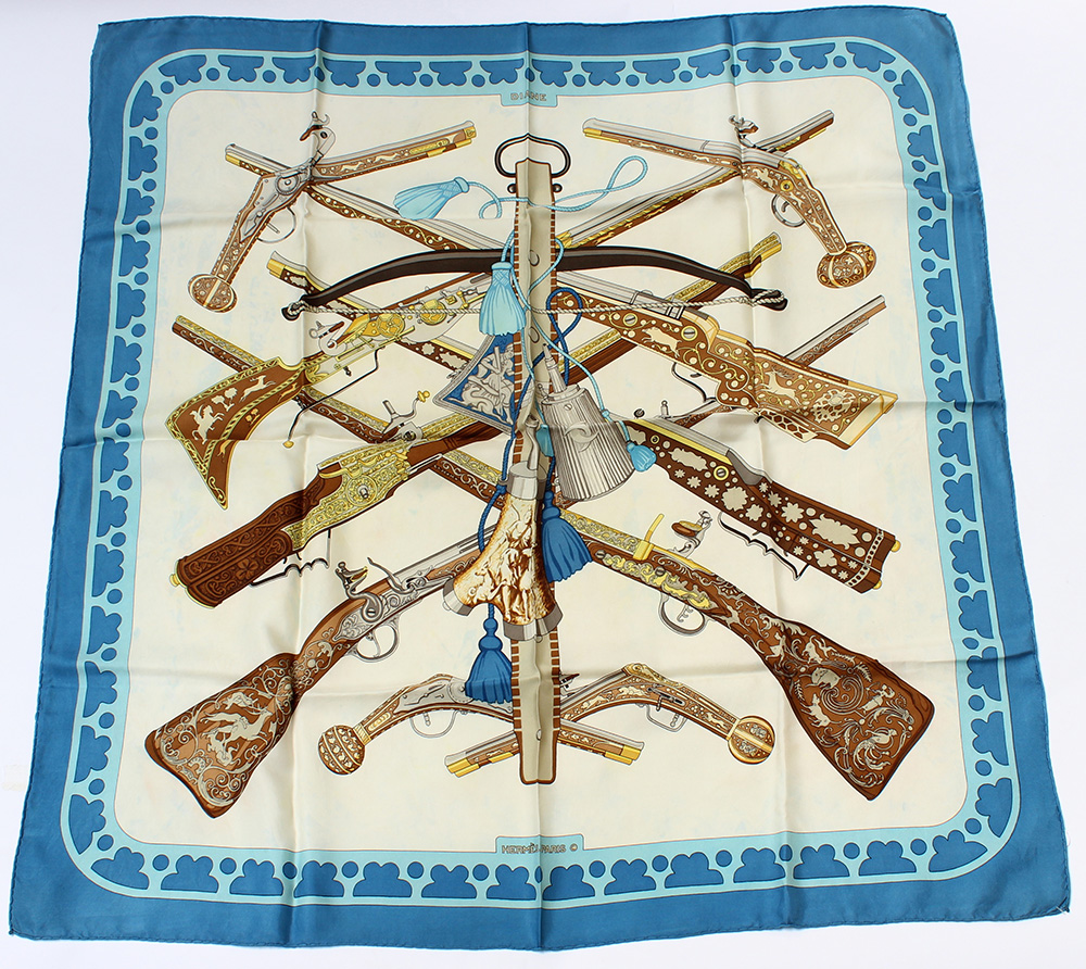 HERMÈS Foulard in seta "Diane", Henri de Linarès 1972 su fondo bianco, bordo...