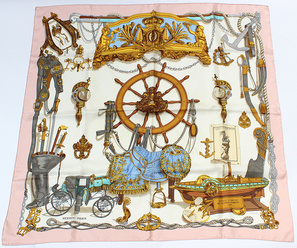 HERMÈS Foulard in seta "Musée", Philippe Ledoux 1962, Fondo bianco bordo rosa...