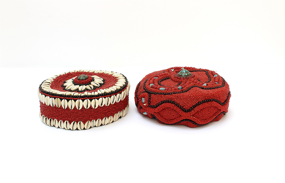 Due cappelli nordafricani decorati con corallo rosso, conchiglie e turchesi