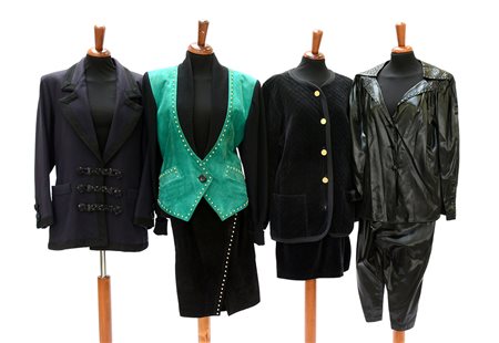 VARIATION Lotto composto da un completo in lana e camoscio nero e verde smeraldo rifinito con borchie color oro, un cmpleto in materiale tecnico, giacca con pinocchietti, un completo trapuntato giacca e pantalone e un giacca nera con alamari (misure viarie) (lievi segni d'uso)