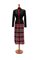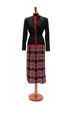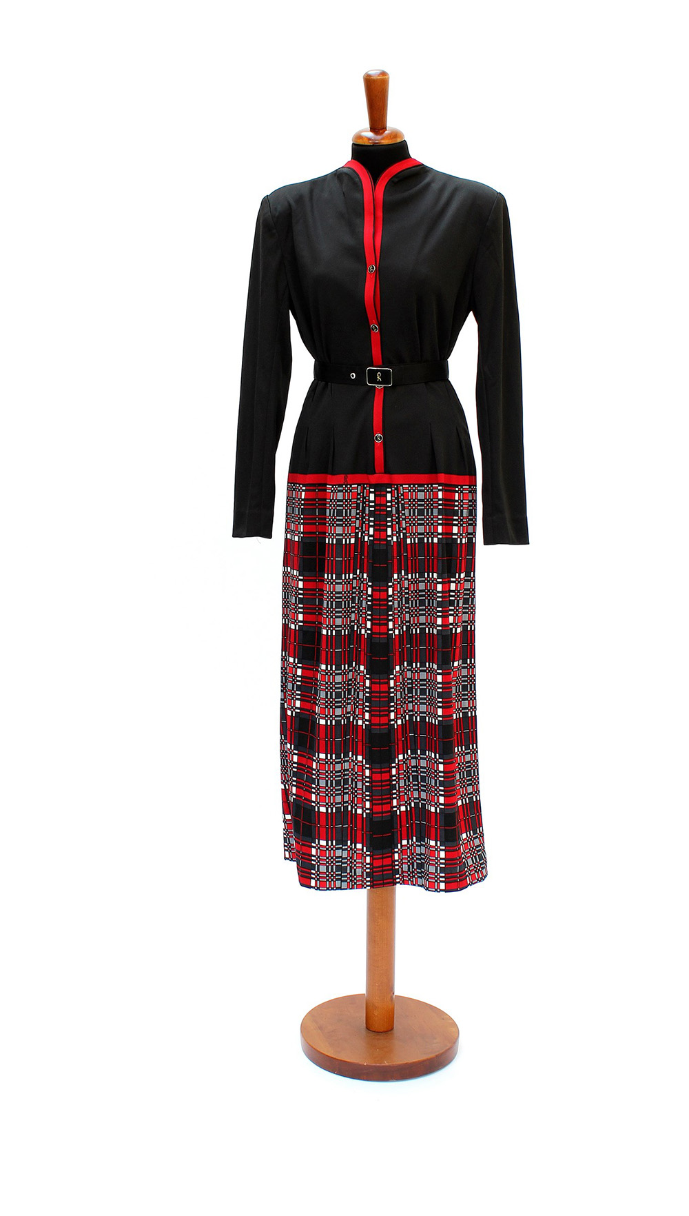 Vestito lungo in jersey, manica lunga, giro collo, disegno asimmetrico nei toni del nero, marrone e bianco, bottoni logati (tg. 38)