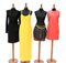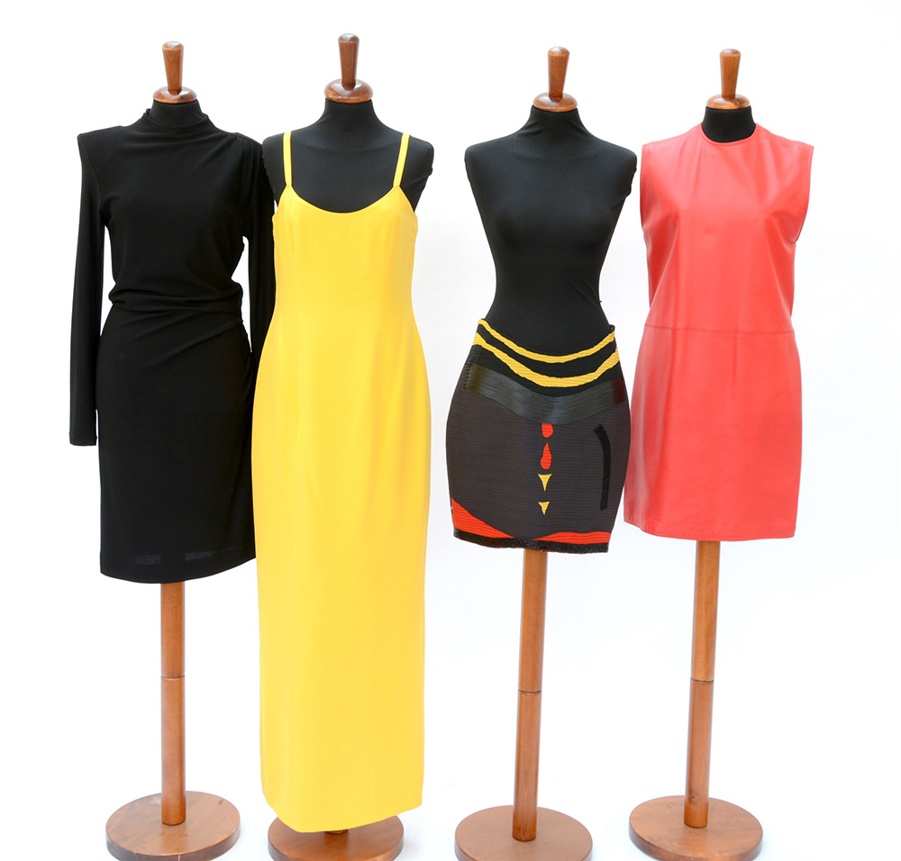Lotto composto da un abito smanicato in nappa rossa, un vesito a canottiera lungo in seta giallo polenta, un vestito a tubino in lanetta, una tuta beige in tessuto strech e una minigonna con intarsi in pelle e paillettes nei toni del rosso e giallo su fondo nero. (tg. 40/42)