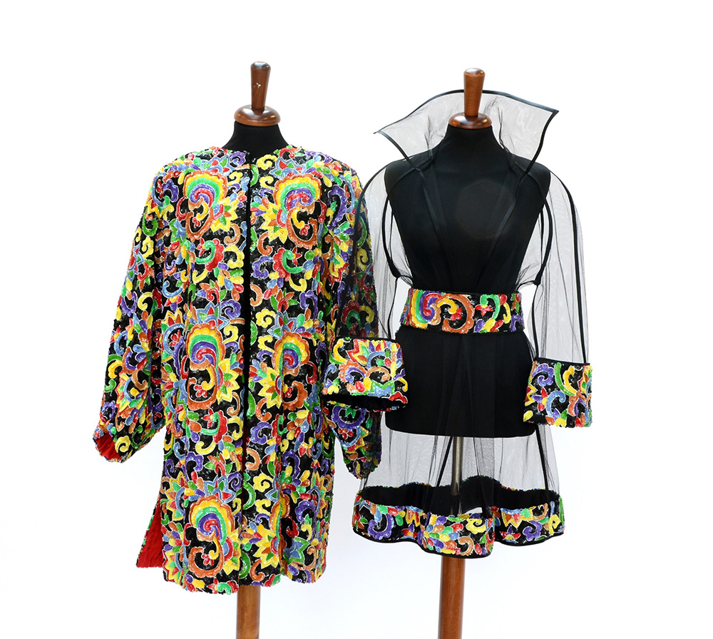 Giaccone a Kimono con cintura ricamato in paillettes multicolor su base nera come la bordatura del coprispalle in tulle (tg. 42/44)