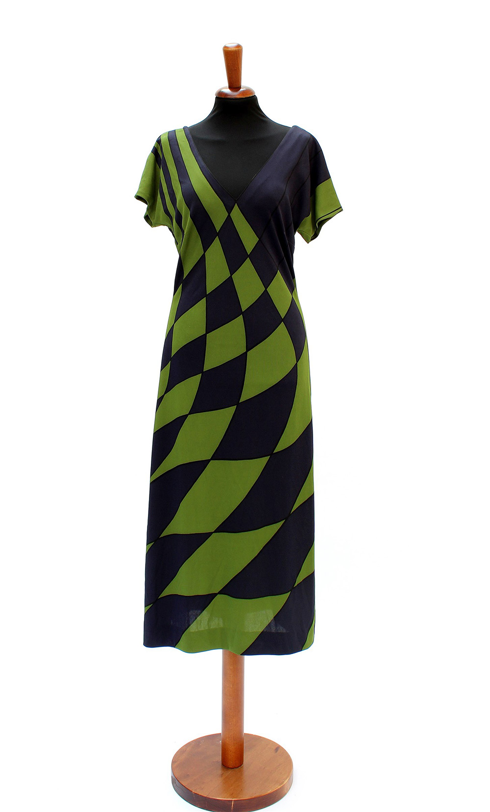 A calf-length jersey dress with large asymmetric blue and green diamond pattern, "V" neckline (tg. 42) (minor signs of wear)