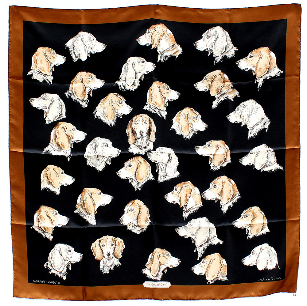 Foulard in seta "Monarch", Xavier de Poret, 1974, fondo nero, bordo color castagna, scatola originale