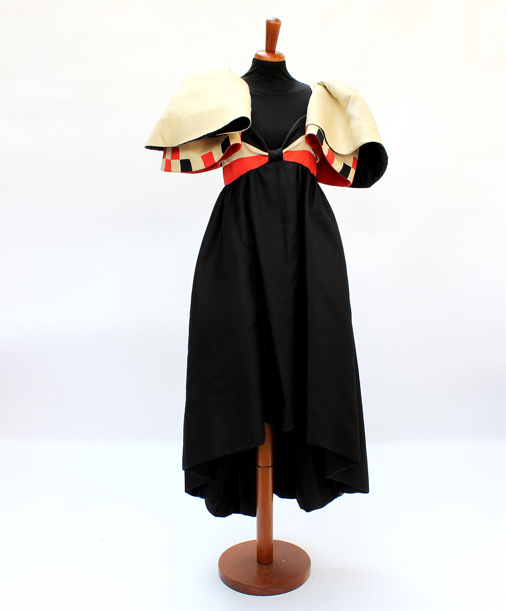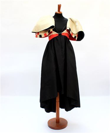 Vestito in seta nero con importanti maniche a strati nei toni del ruggine e avorio (tg. 42)