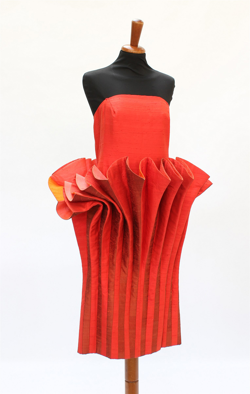 A typical sculpted corolla style orange and pale rust shantung dress (tg. 42)