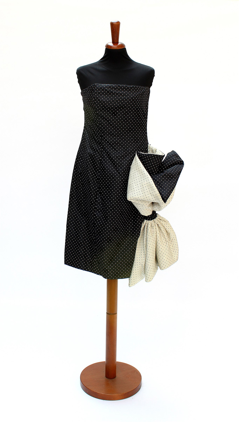 A black and white micro-polka dot silk dress with large side ruffle and bow (tg. 42) (minor signs of wear)