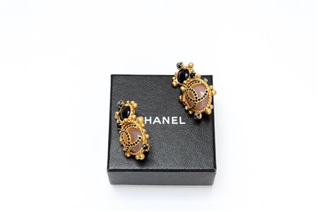 CHANEL Paio di orecchini a lobo con perno in onice e quarzo rosa rifiniti con...