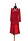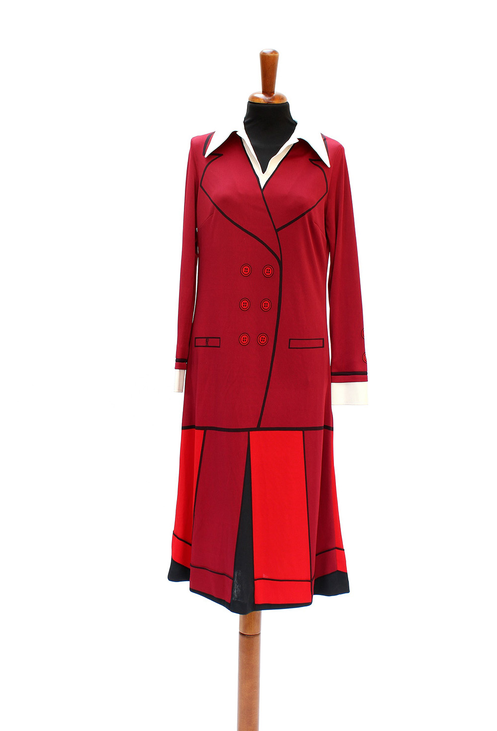 Vestito longuette "trompe l'oeil" in jersey, giacca doppio petto con gonna a pieghe, nei toni del rosso, grande colletto e polsini bianchi, gemelli logati (tg. 46) (cm 12x22) (lievi segni d'uso)