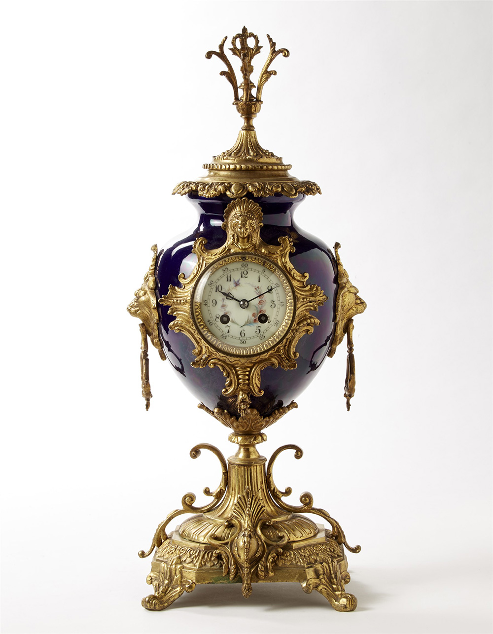 mantle clock Blue porcelain and bronze urn-form mantle clock