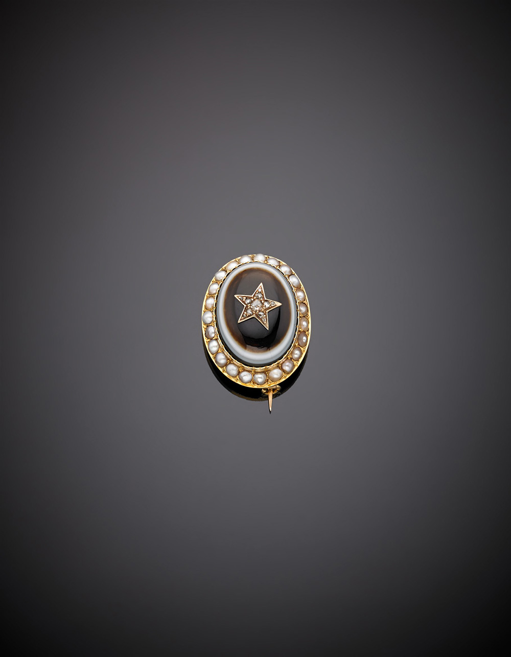 Spilla in oro giallo con perle e stella in diamanti su agata, g 11,90, lungh....