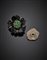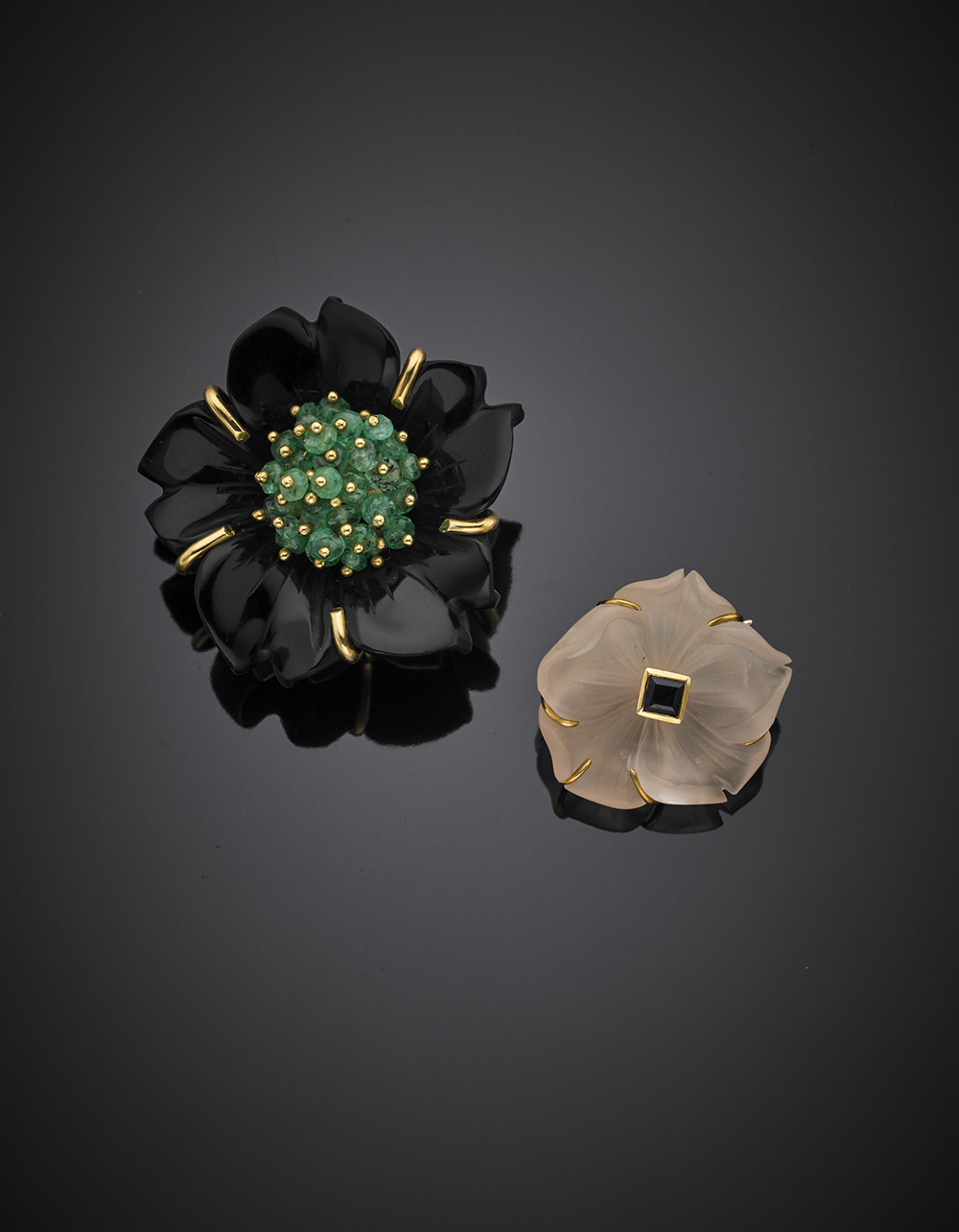 Yellow gold brooch and pendant, the first with onyx and emeralds, the second hyaline quartz and sapphire, in all g 22.11.