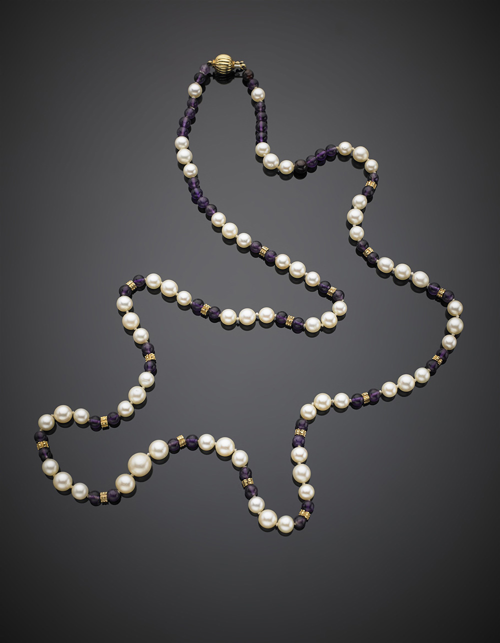 Long pearl and amethyst bead graduated necklace, with yellow gold spacers and clasp, g 45.46, length cm 84 circa.