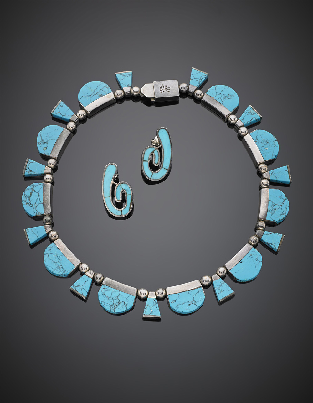 Demi-parure composta da collier ed orecchini ad elementi geometrici in turchesi e argento, g 138,64, lungh. cm 42 circa.