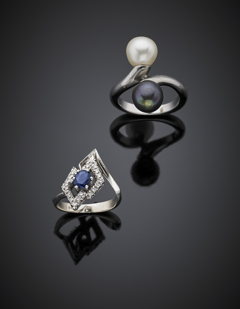 Due anelli in acciaio e oro bianco a contrarié con due perle il primo e con zaffiro e pietre incolori il secondo, complessivi g 9,98 misura 12/52. Uno firmato Morellato.
