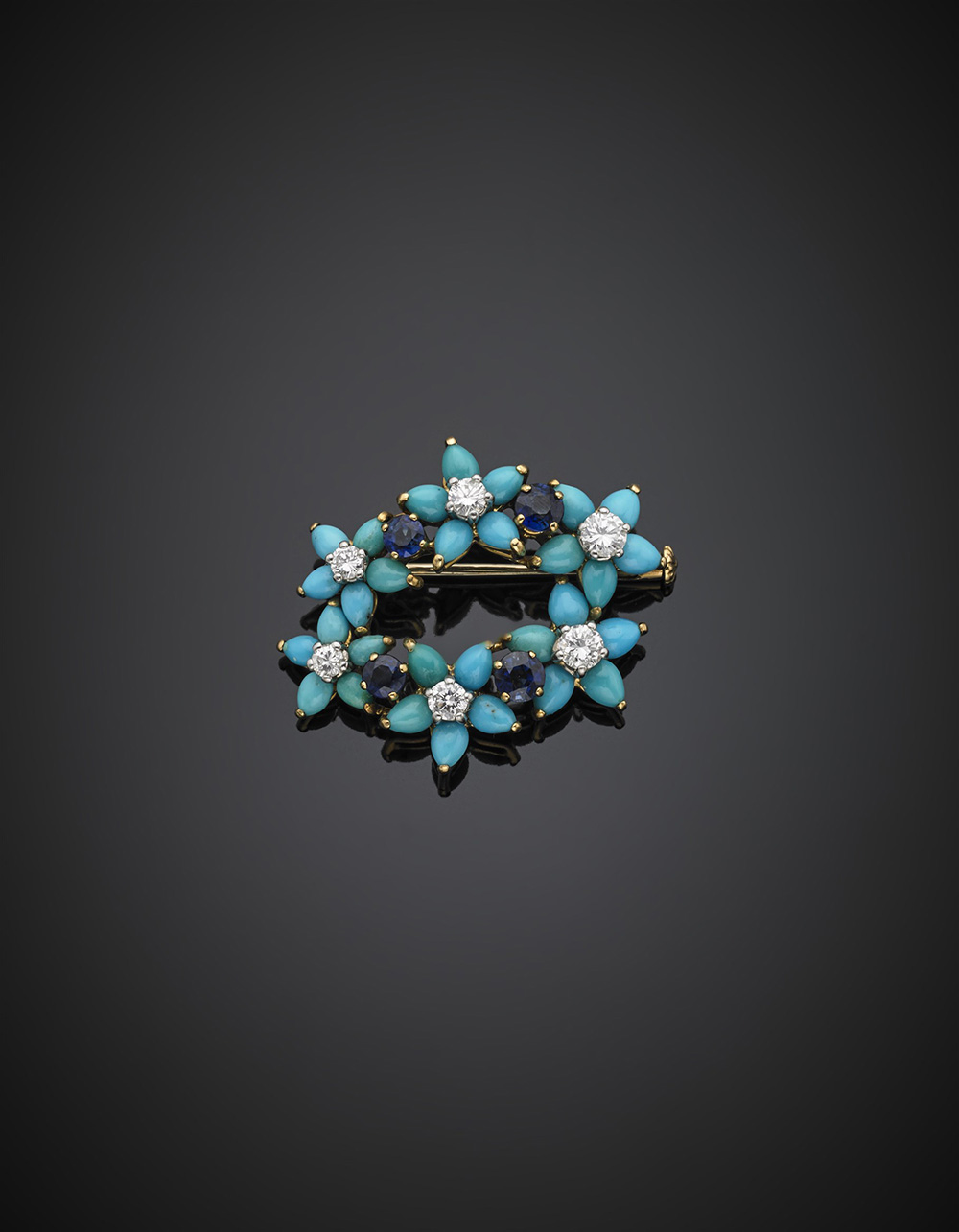 Spilla in oro giallo e bianco con piccoli fiori, rifiniti in diamanti e turchesi e distanziati da zaffiri, g 7,55, lungh. cm 3 circa.