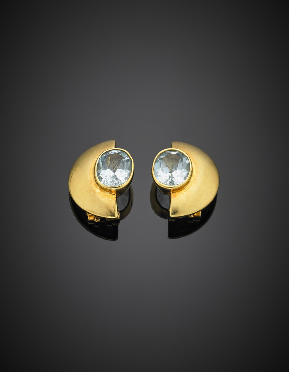 Orecchini a lobo in oro giallo con due topazi azzurri ovali, g 9,69.