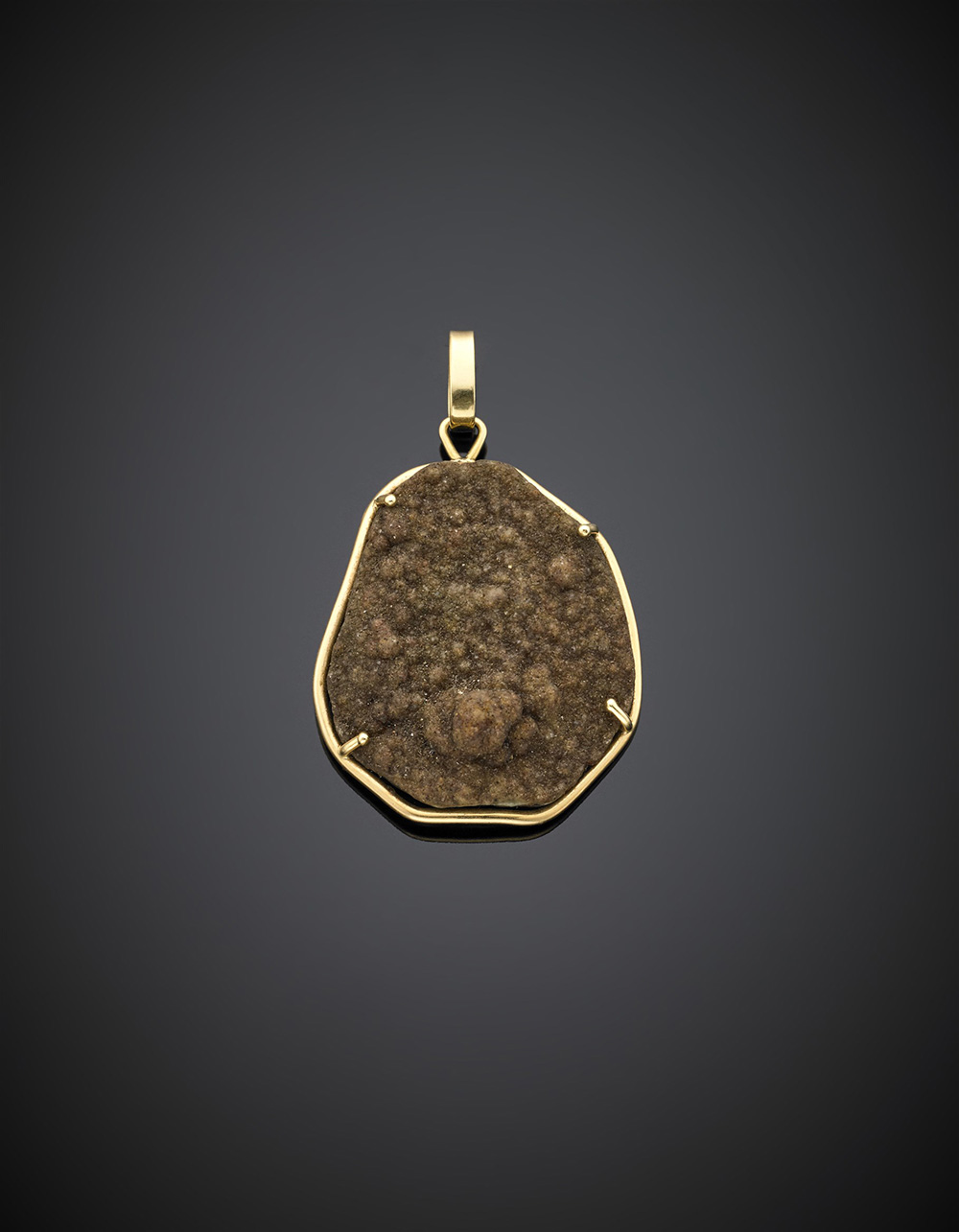 Pendente in oro giallo con quarzo microcristallino fumè, g 5,33, lungh. cm 3,80 circa.