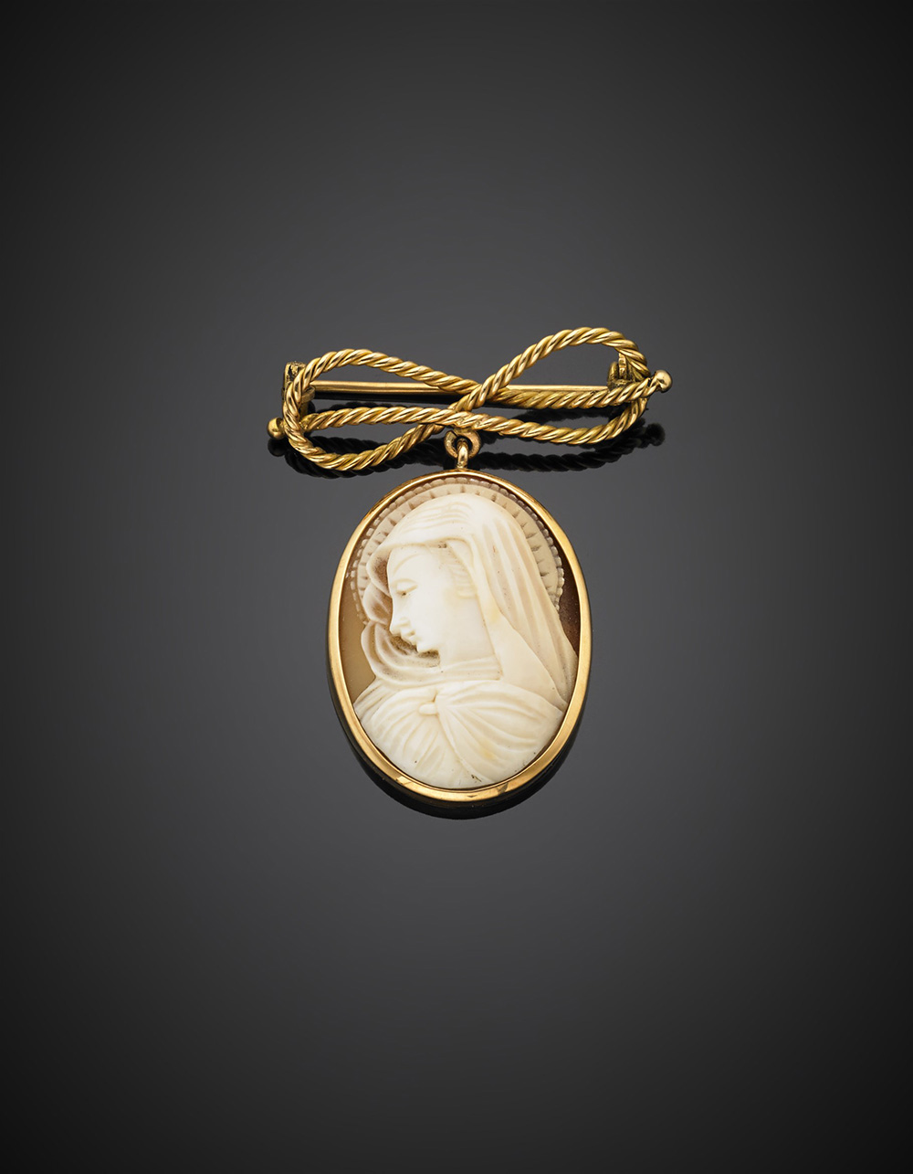 Broche in oro giallo a guisa di cordone con nodo Savoia e pendente cammeo, g...