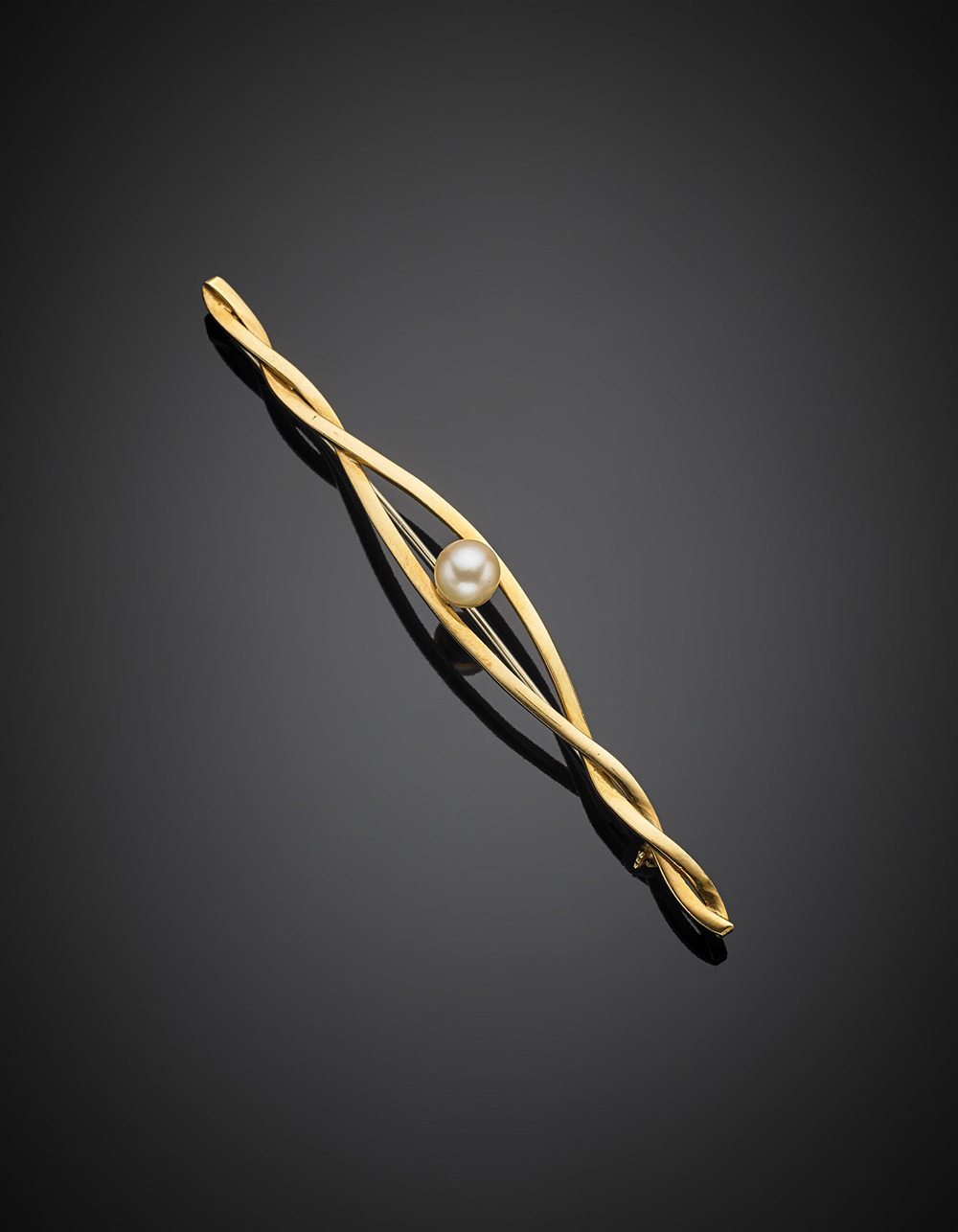 Lotto 490 | Spilla in oro giallo a barretta intrecciata con perla, g 11,23, lungh. cm...