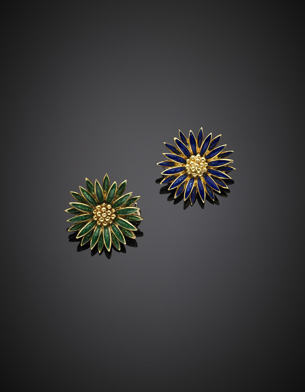 Due spille a fiore in oro giallo, smalti verdi e blu, complessivi g 11,25.