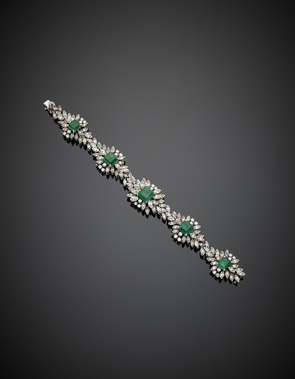 Bracciale a moduli floreali in oro bianco, diamanti rotondi e smeraldi carré, g 33,95, lungh. cm 16,50 circa.