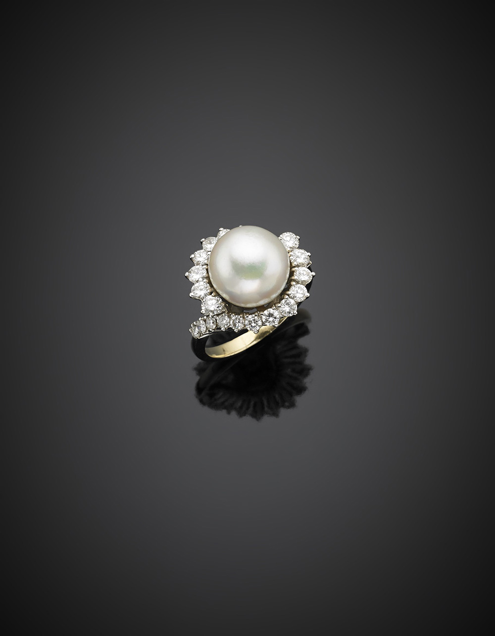 *MISSIAGLIAAnello in oro bianco con perla centrale e diamanti intorno per...