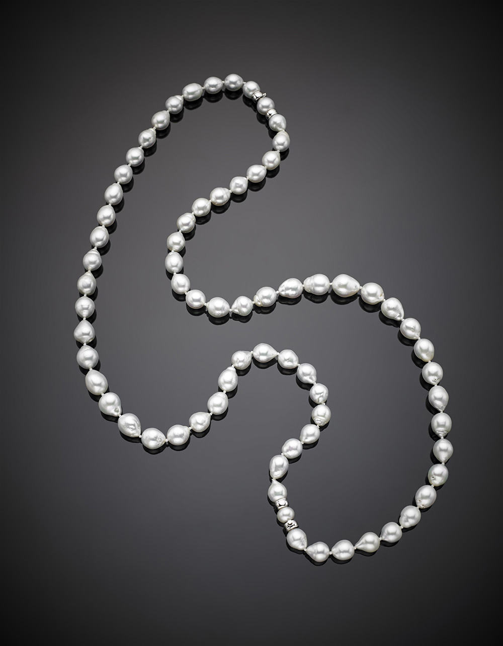 Collana di perle South-sea irregolari e scalate di color bianco/grigio composto da due collane separabili, chiusure in oro bianco, complessivi g 98,68, lungh. cm 88,80 circa.