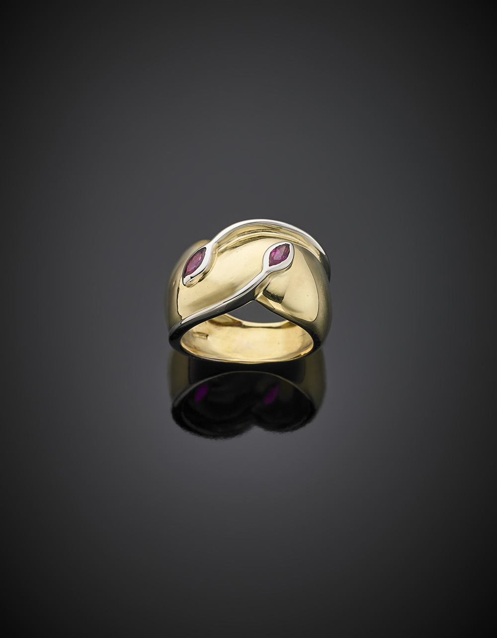 Marquise ruby bi-coloured gold crossover band ring, g 10.31 size 19/59. Signed FARAONE.