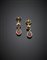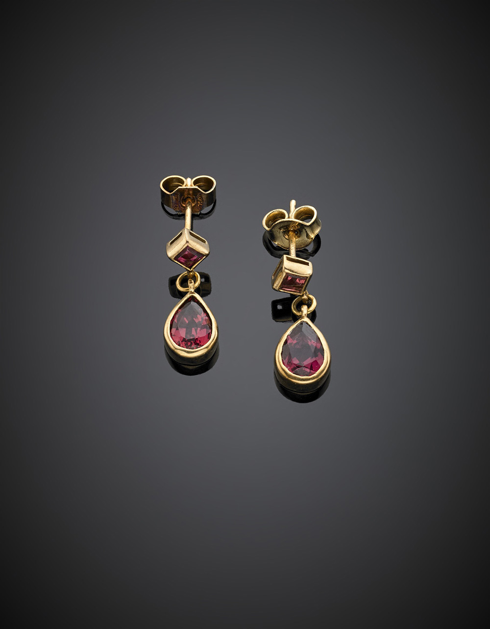 Lotto 561 | Orecchini in oro giallo con granati a goccia e carré, g 3,23, lungh. cm 1,90...