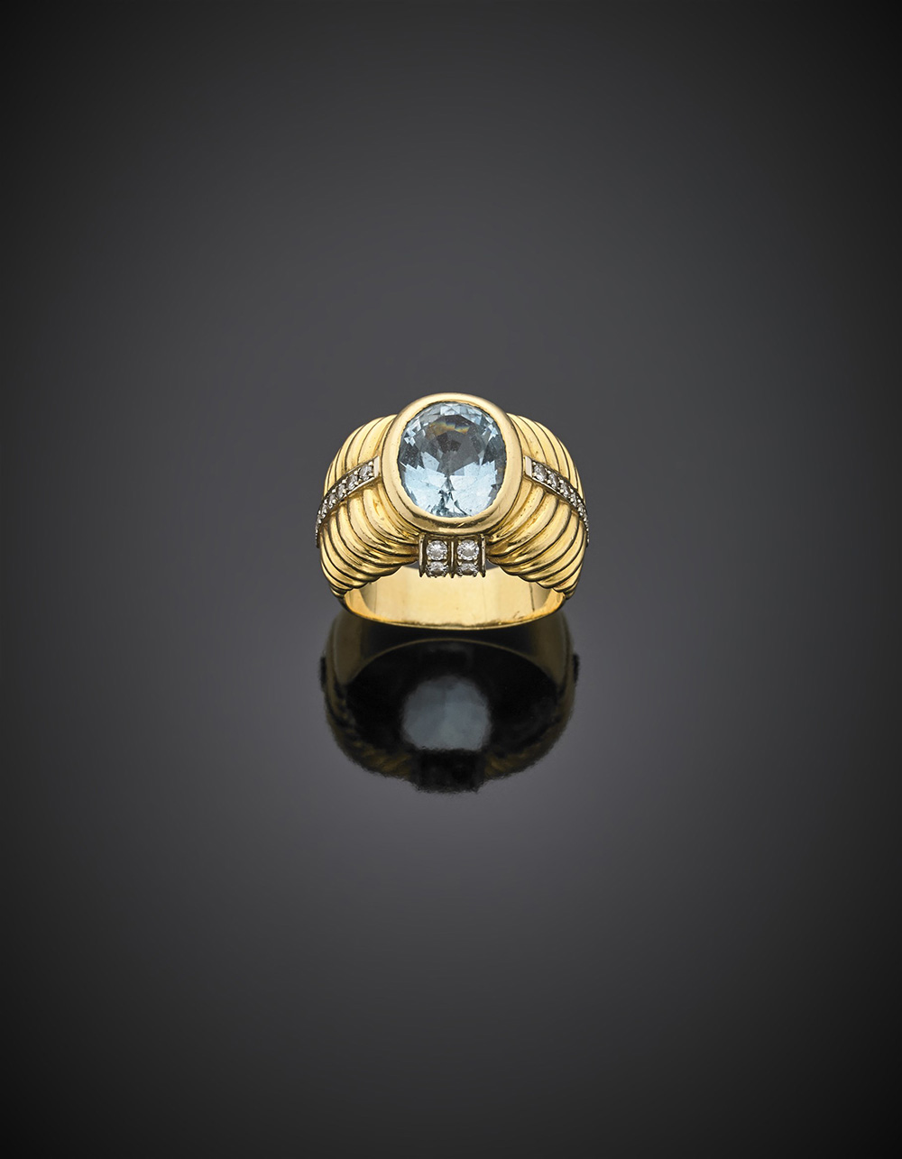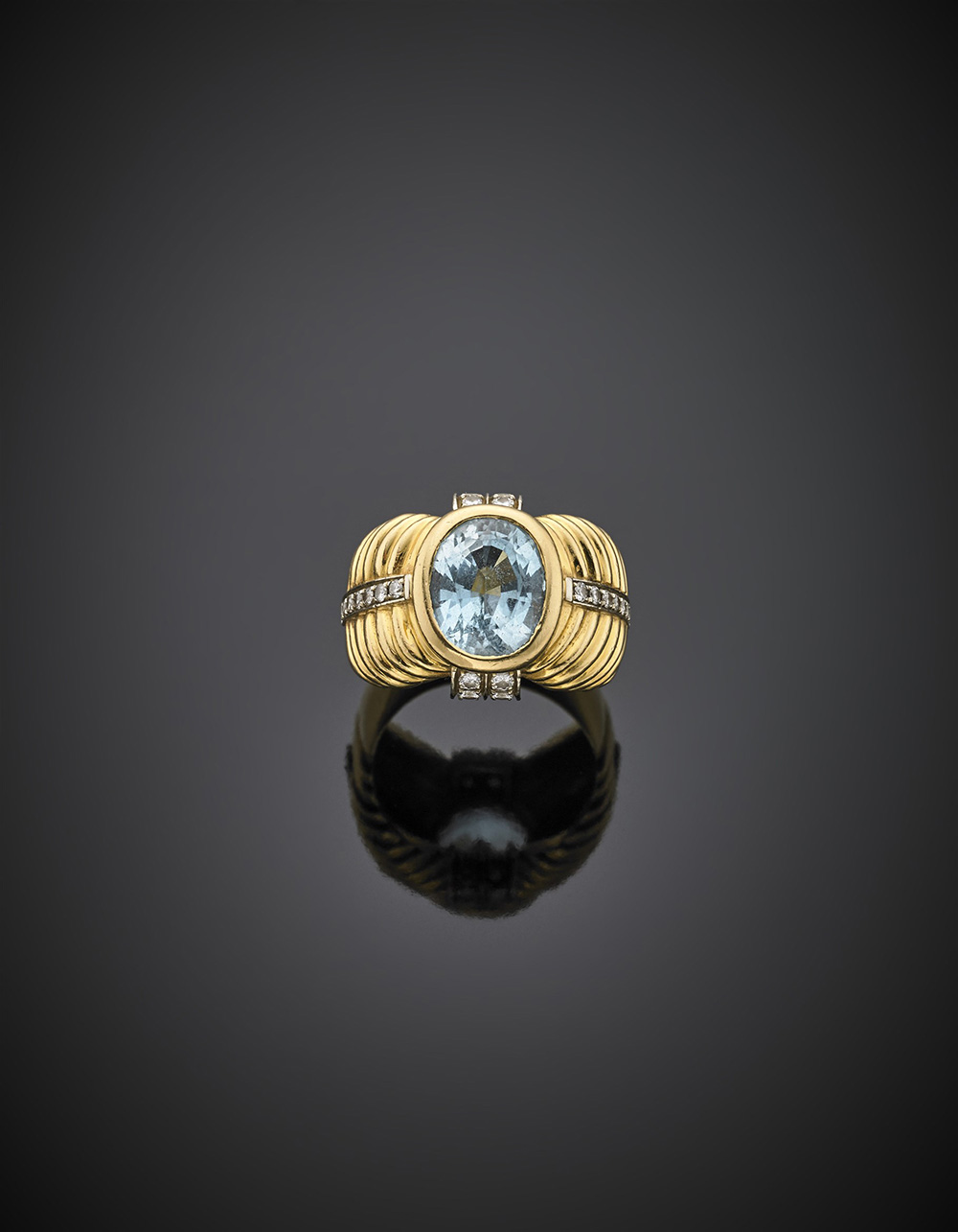 Anello in oro giallo con topazio azzurro ovale di ct. 4,16 circa, costolato sul gambo e rifinito in oro bianco e diamanti, g 14,09 misura 15/56.