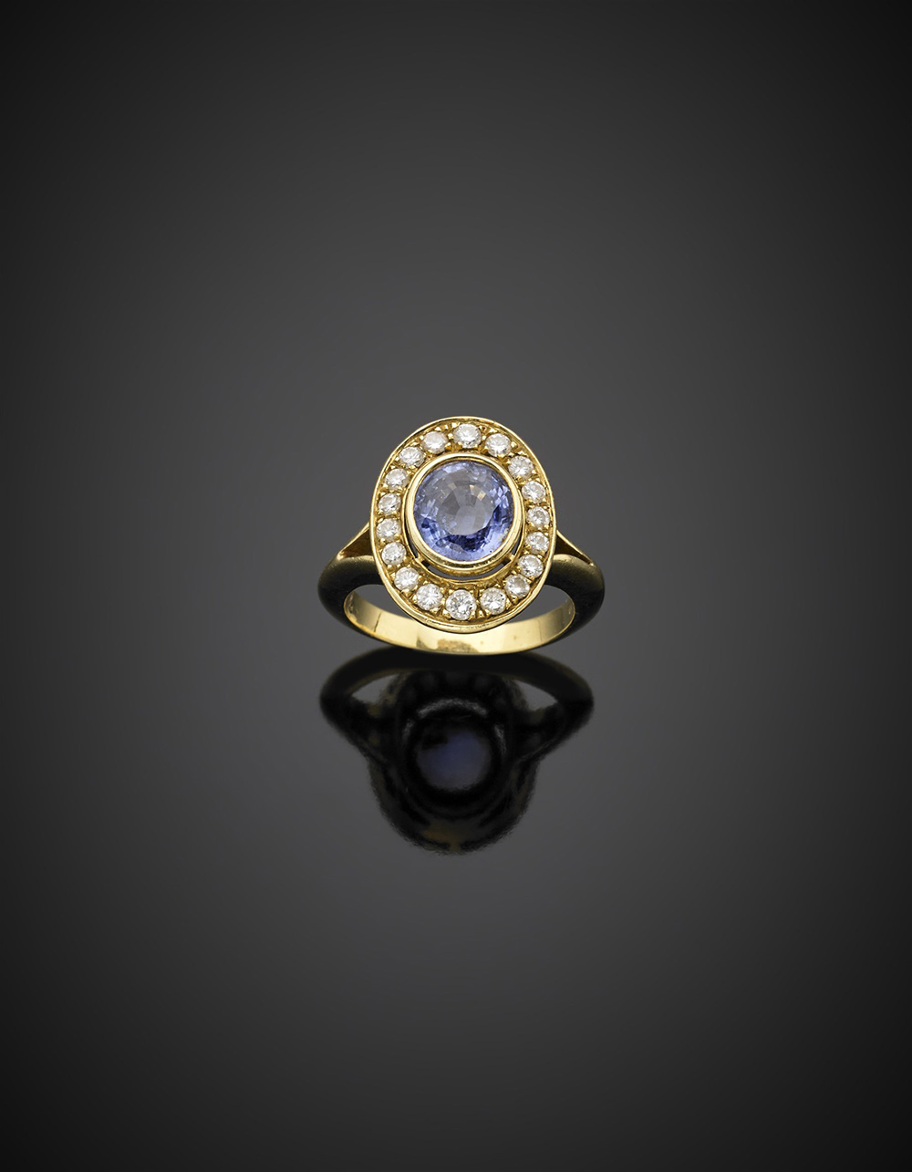 Anello in oro giallo, con diamanti rotondi a contornare uno zaffiro ovale di...