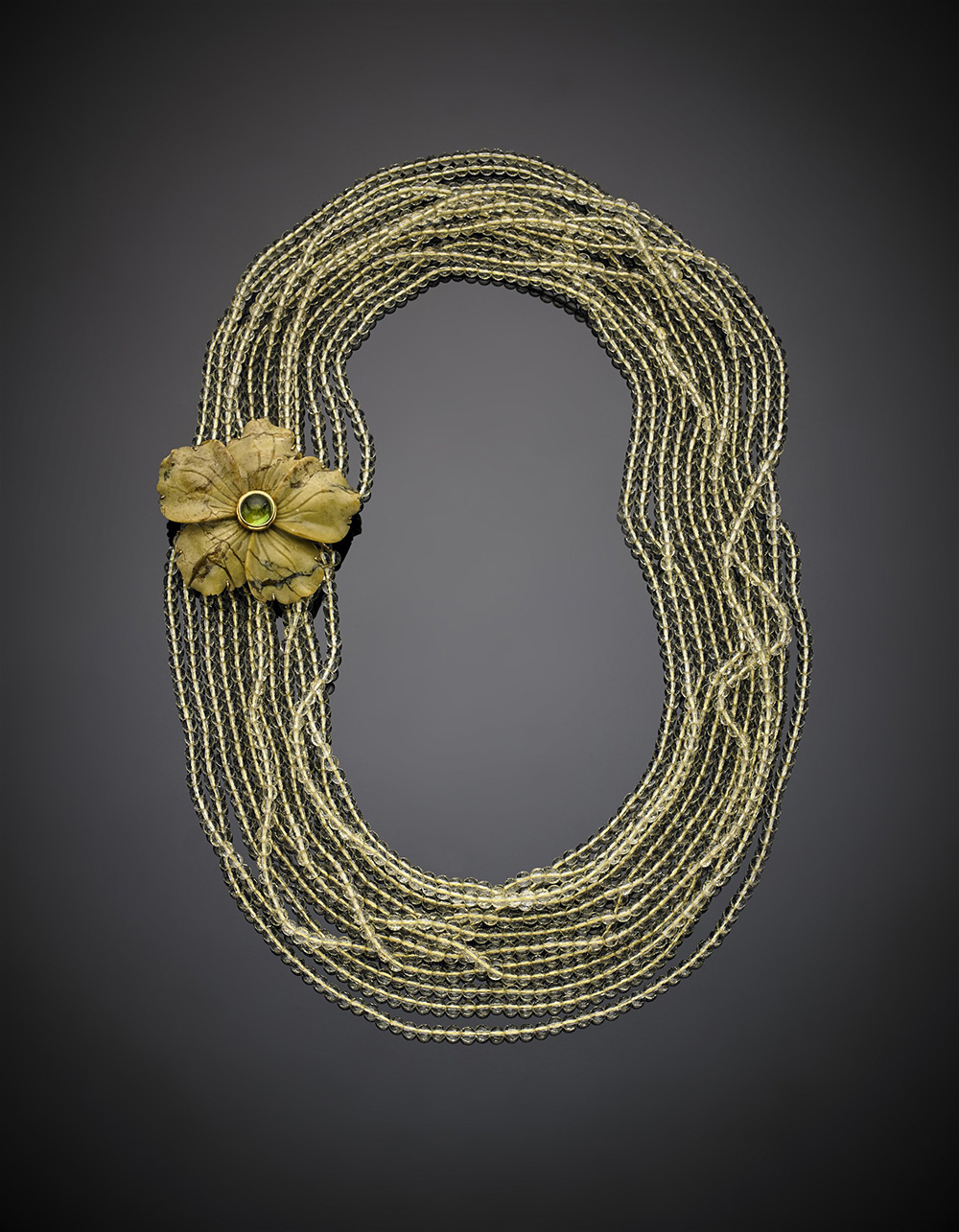 Multi Strand light citrine quartz faceted bead necklace, yellow gold green cryptocrystalline quartz flower clasp with a green cabochon beryl, g 206.67, length cm 54 circa.