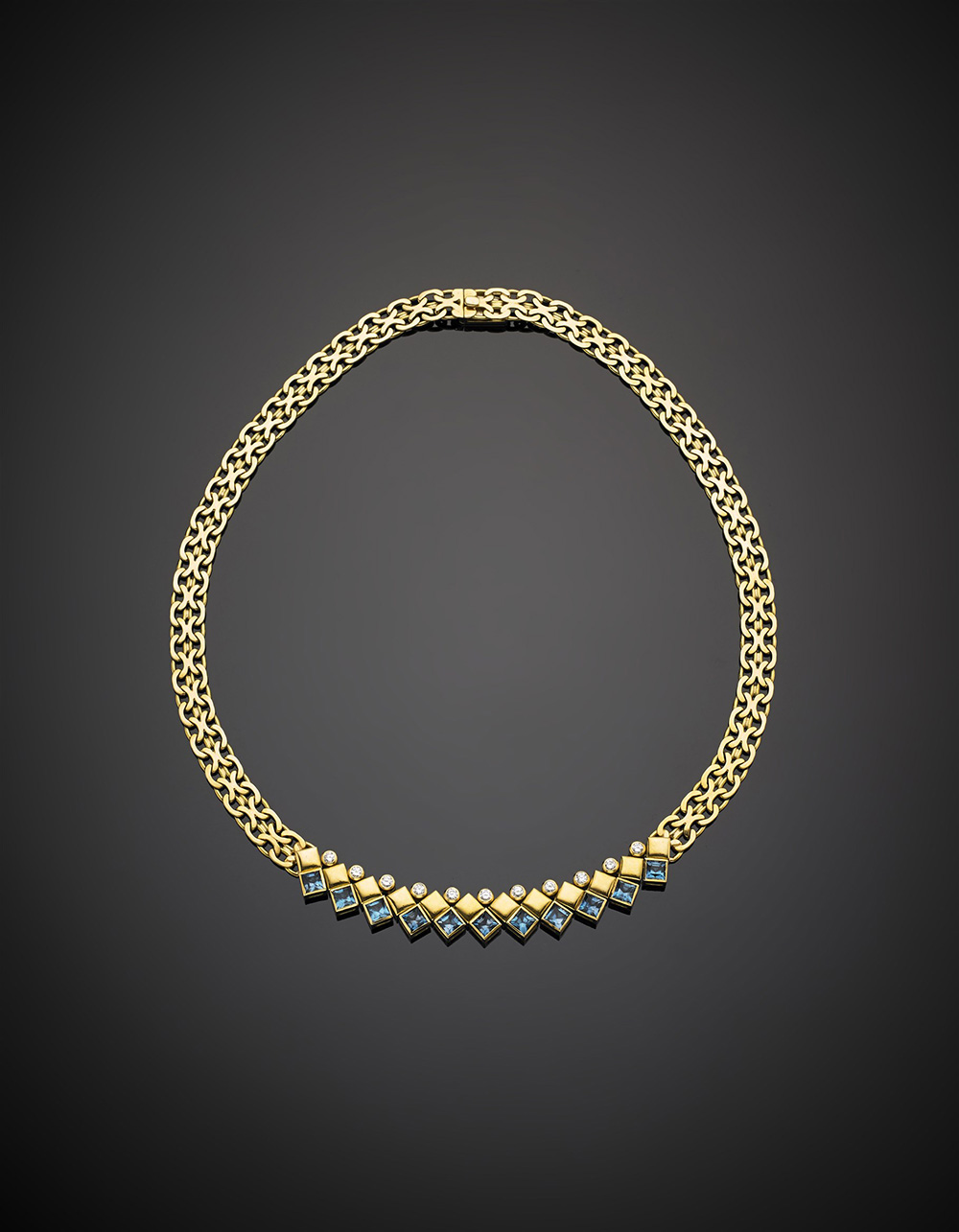Collier in oro giallo a doppia catena piatta, con parte centrale a rombi rifinita con topazi azzurri carrè e diamanti rotondi, g 46,59, lungh. cm 42,80 circa.