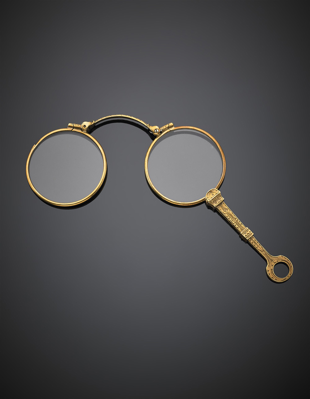 Lorgnette pieghevoli in oro giallo cesellato, lordi g 25,91, lungh. cm 10 circa.