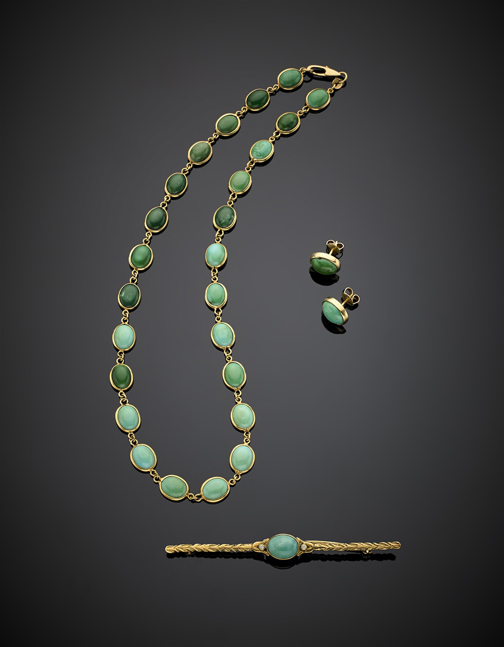 Yellow gold turquoise lot comprising a necklace, earrings and a brooch, necklace length cm 40 and brooch cm 7.50 circa, in all g 22.43.