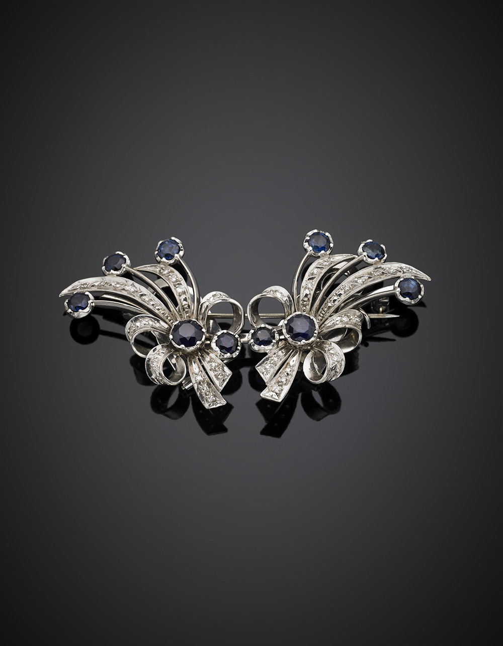 Doppia broches in oro bianco con diamanti e zaffiri, trasformabile in orecchini, g 23,37, lungh. cm 7 circa.